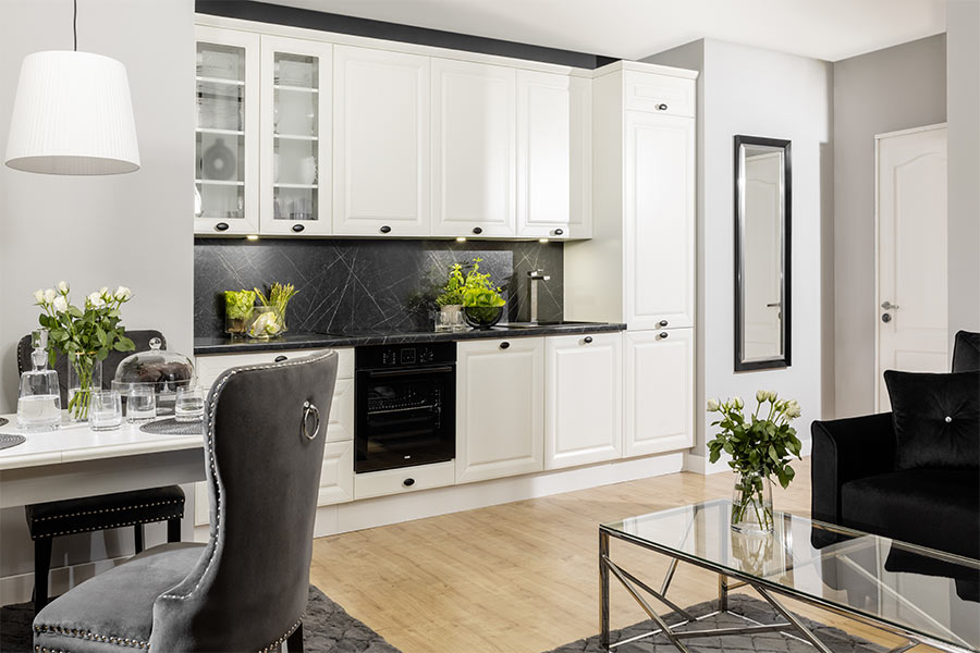 Die harmonischen Rahmenprofile verleihen der Front ihre charakteristische Tiefe und machen sie zu einem echten Blickfang. Sie wirkt sowohl in großen Wohnküchen als auch in kleineren Räumen edel und einladend. In Kombination mit einer dunklen Arbeitsplatte entsteht ein ansprechender Kontrast, der klassische Eleganz mit moderner Klarheit verbindet.
